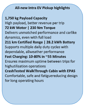 Joining the Ace EV 1000 and Ace Pro EV, the Intra EV Pickup strengthens Tata Motors’ comprehensive electric small commercial vehicle portfolio—built to support India’s entrepreneurs, drivers and fleet owners in building more efficient businesses and a more sustainable future.